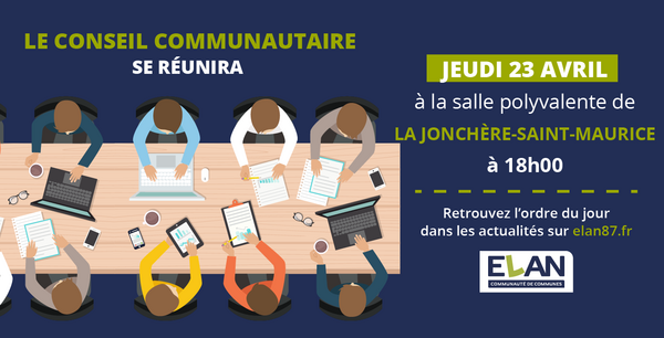 Le prochain conseil communautaire de la Communauté de communes ELAN se déroulera le jeudi 23 avril 2026 à la salle polyvalente de La Jonchère-Saint-Maurice à 18H00.